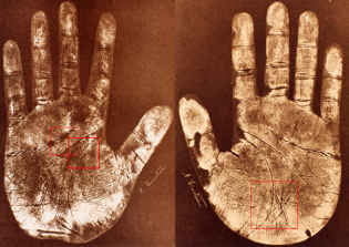 这张手图的左手2线的尾部出现的方格纹,提示这时的爱因斯坦已经出现肠粘连,及有腹部手术史。爱因斯坦有过两次腹部大手术史,年龄是66岁和69岁,这张手图出现手术史,表示这张手图是66岁以后印的。通过这张手图也可以推测爱因斯坦印这张手图的年龄。