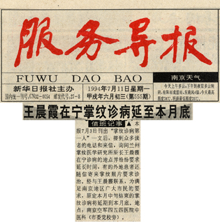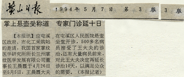 · 1994年2月25日《消费报》刊登“掌纹神医义务就诊”