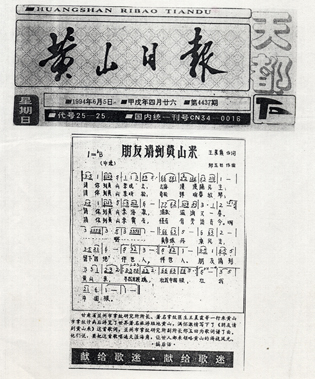 1994年6月5日《黄山日报》刊登王晨霞所长浏览黄山后写的歌曲“朋友请到黄山来”