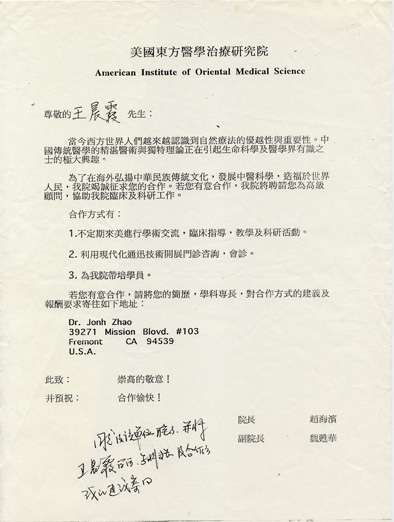 · 1996年7月29日美国东方医学治疗研究所合作意向