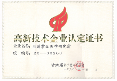 · 1996年1月1日,兰州掌纹医学研究所被甘肃省科学技术委员会认定为“高新技术企业”。