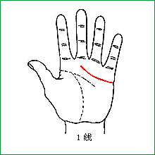 1线,也称远端横曲线、感情线、天线等。 从手掌的尺侧伸向食指与中指之间下方,以弧形、反向抛物状呈现,以深长、明晰、颜色红润、向下的分枝少为正常。 摘自:《现代掌纹诊病》