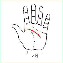 2线,也称近端横曲线、小鱼际抛物线、智慧线、心线。因与大脑及神经系统功能密切相关,所以又称为“脑线”,它所提示的疾病,偏重于神经、精神方面及心血管系统,智力高低、外伤都可以从2线上反映出来。 正常的2线,抛物线的最高点位于手掌中央,起于食指近节关节腔的边缘,向小鱼际抛行,止于无名指中线。粗而长、明晰不断、颜色红润、略微下垂,近掌心末端可有分支。凡具备标准型2线者,多身体健康,充满活力,心情愉快。 摘自:《现代掌纹诊病》
